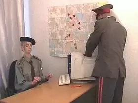 Uniformed military officers have sex with his submissive transcriber on his desk